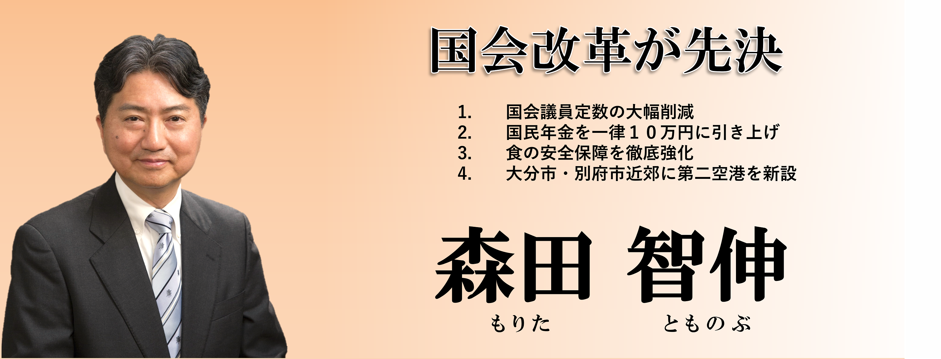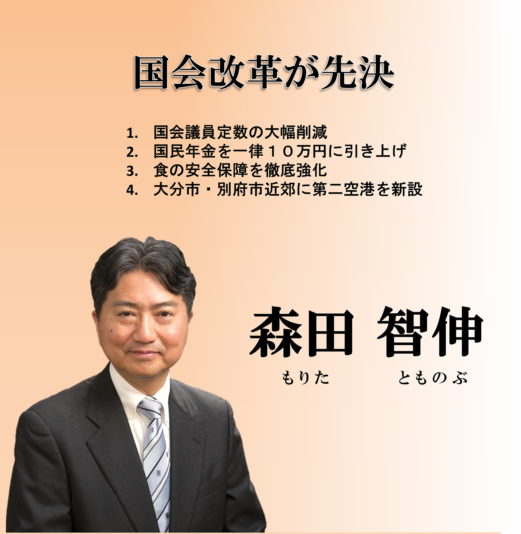 ⇒ 衆議院(現行465名)は比例代表(176名)を廃止し、小選挙区(289名)のみとする。 参議院(現行248名)は地方選挙区(148名)を廃止し、全国区の定数も半分(50名)とする。 将来的には一院制に移行。(但し、そのためには憲法改正が必要となる) - 調査研究広報滞在費(旧文通費)を現行の1人月100万円(全体で年85億円)から50万円に減額する。